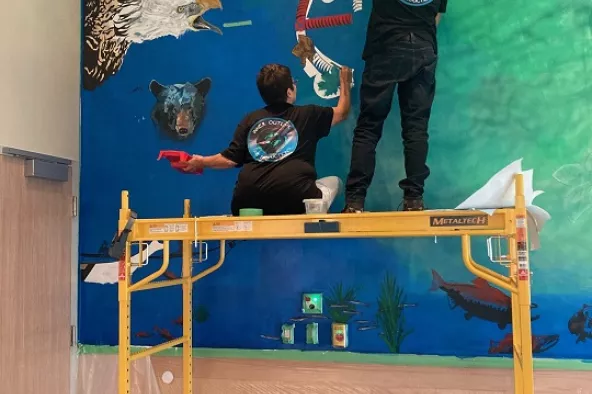 The mural features wild B.C. animals and water life, which Rosalie explains play an important role in recovery and healing.